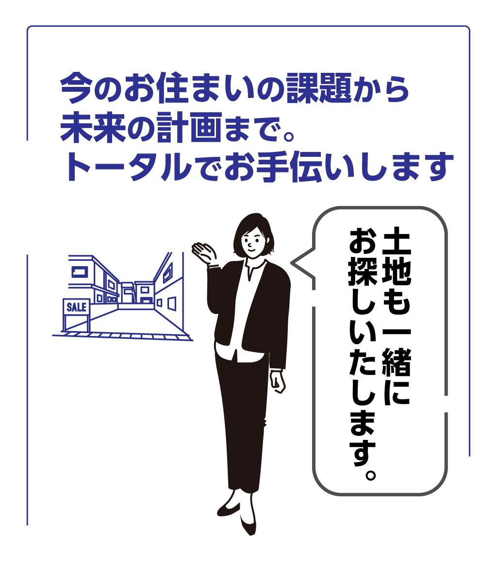 A. 建築法令のチェックや間接費用の有無などが御座いますのでご購入前のご相談をおすすめしております。土地探しのお手伝いも無料で行っております。