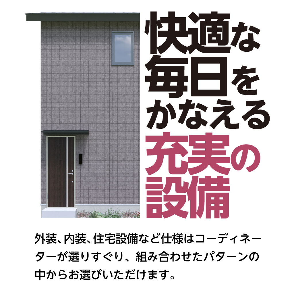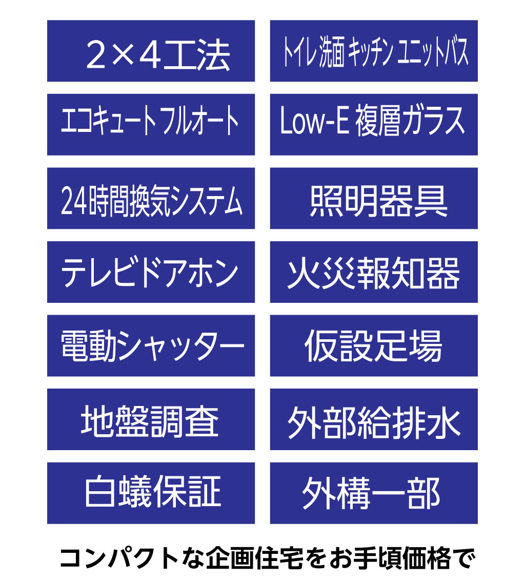 販売価格には地盤調査、外部給排水、電気工事など多くの項目を含んだコミコミ価格です。資金計画をスムーズに進めることができます。