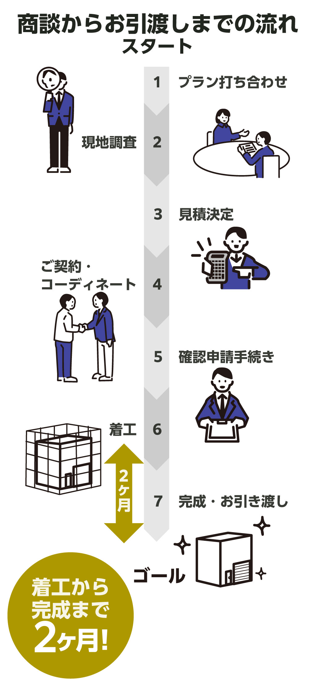 着工から納品まで約2ヶ月間という短い工期で、建築が可能です。自社工場でパネル化を行い、現地で組み立てるので、高い精度と速さを両立しています。
