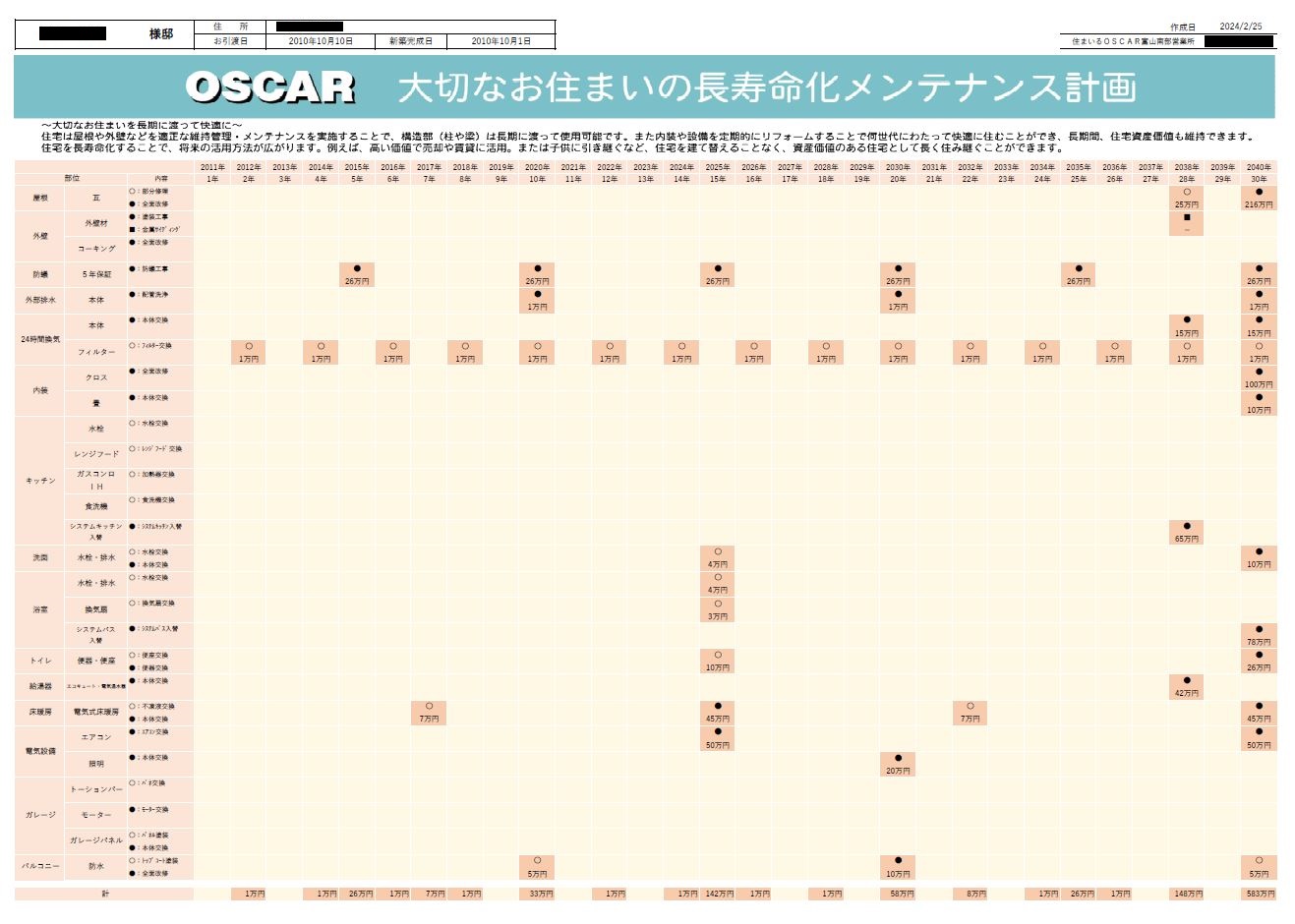 維持管理「メンテナンスの重要性」の啓蒙活動として、長期に渡ったメンテナンス計画を年表にしてご案内しています。