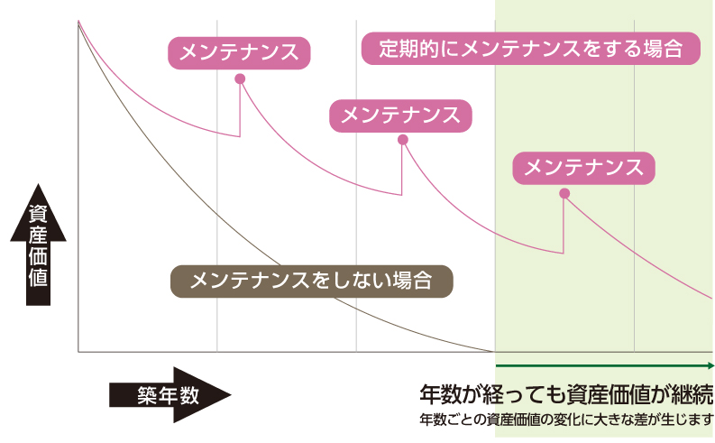 適正な時期に適切なメンテナンスを実施することで最小限の費用で住宅の資産価値が保たれます。
