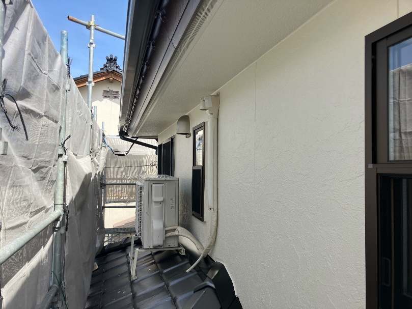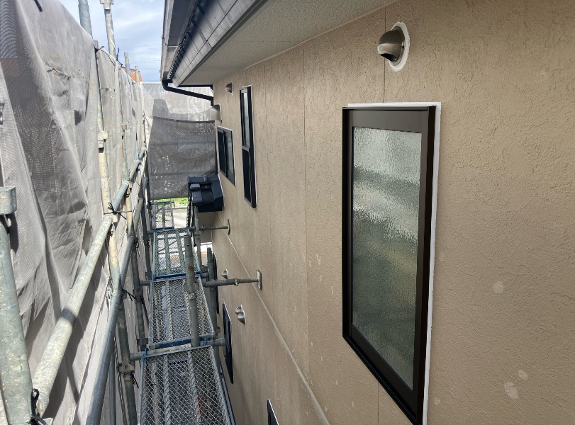 付帯物を取り付けた後、防水コンセントや電気メーターの廻り等、付帯物の周りをコーキング処理します。翌日足場を解体し、仮設トイレを撤去したら工事は終了です。
