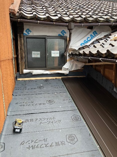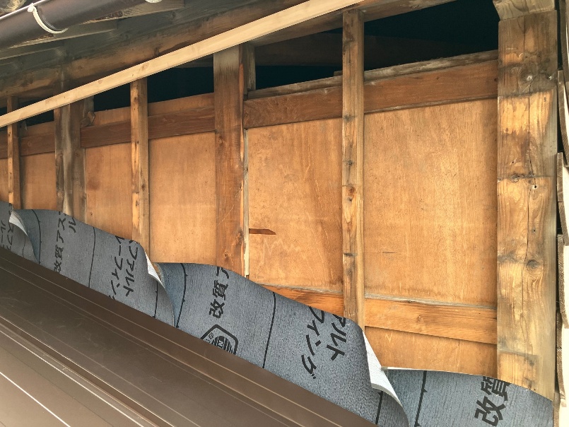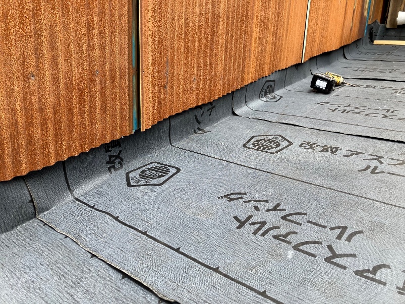 既存屋根の下地合板を交換し、ルーフィングシートを施工。