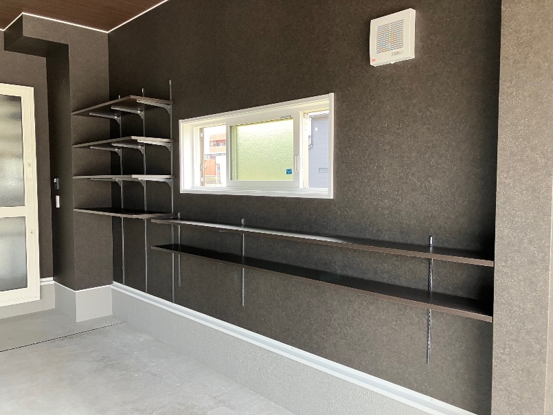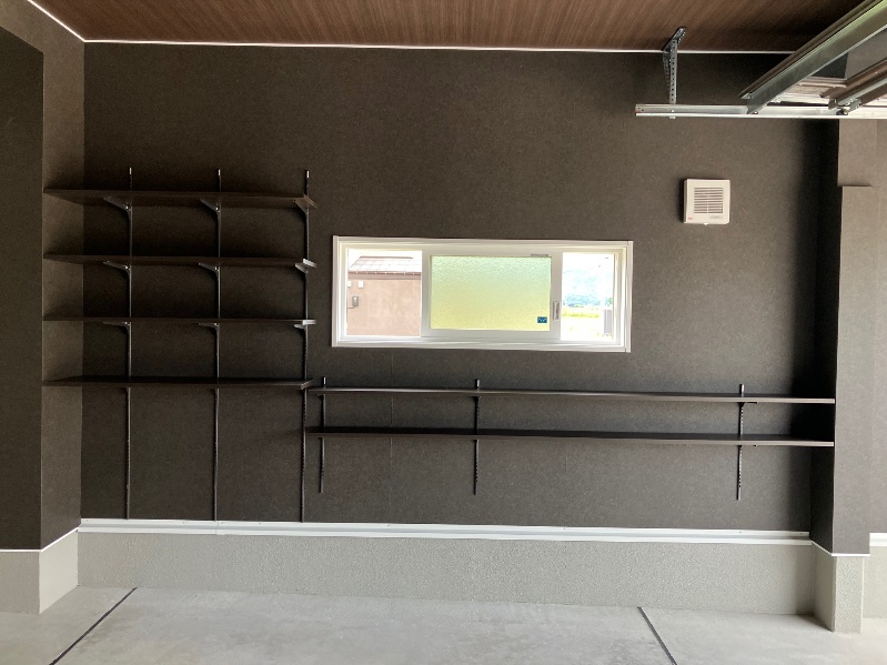 今回はガレージ内の荷物を整理したいので棚を付けたいと相談がありました。荷物のサイズは様々なので、可動式の棚板を取り付けることとしました。
