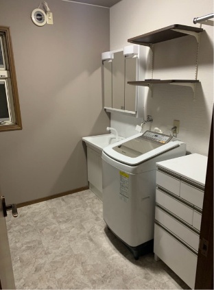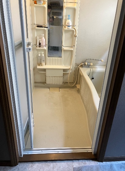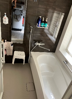 このお宅は2023年3月に脱衣室リフォーム工事をしたばかりで、今回のシステムバス交換工事のため床や壁、洗面化粧台などは既設のままなので、工事担当者が神経を使って綺麗に養生を施してくれました。
