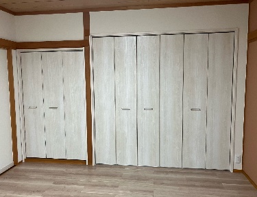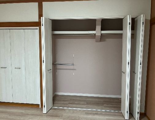 既設物入は両開きから3枚折戸(1折+1枚開き戸)、クローゼット収納折戸は3枚折戸(フリータイプ)。クローゼット内部のクロスは、開けたときにテンションが上がる可愛いピンクの壁紙を採用し、棚板+ハンガーパイプも設置して使い勝手のいい大容量の収納空間ができました。