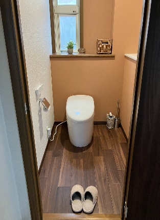 コロンとした卵型フォルムのタンクレストイレも素敵です。アクセントは、テラコッタカラーの壁で、温かみがあり落ち着ける空間となりました。