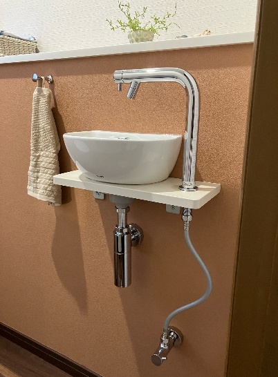 今回は2階の配管スペースがあったので腰壁を設けて壁給水・壁排水での手洗い器を施工しました。こだわりは、壁排水のボトルトラップです。タオル掛けはIKEAのフック付きタオルをご購入され、毎日交換するとの事でタオルフックとしました。