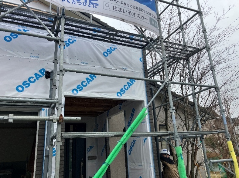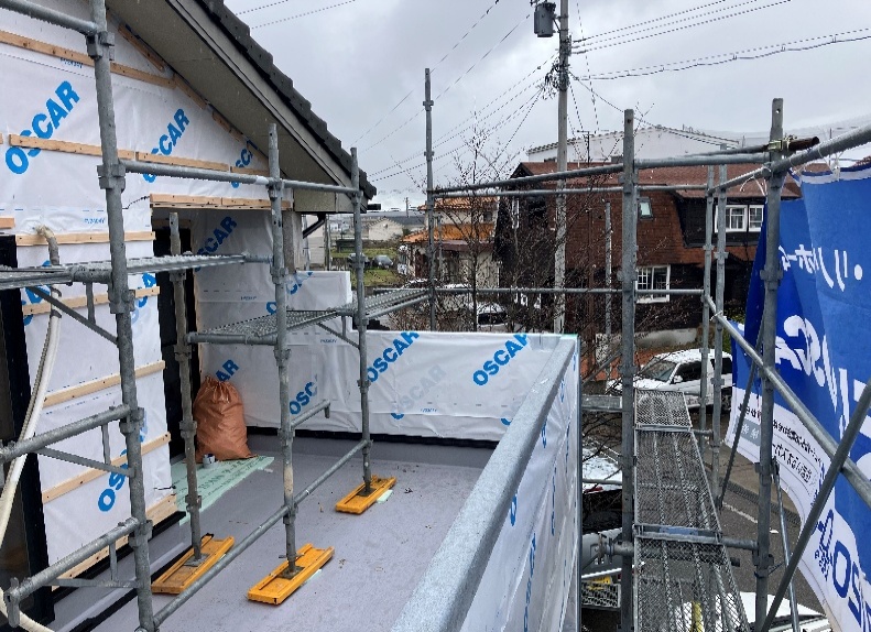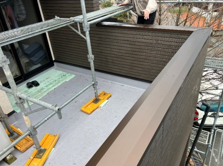 2階の足場に関しては、バルコニー床の防水層がしっかりと乾燥してから足場の組み直しを行いました。