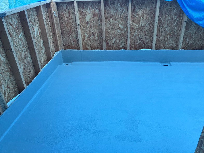 床の下地工事が完了し、ガラス繊維と樹脂を組み合わせて形成されている、FPR防水にて、バルコニー床の防水工事を行いました。