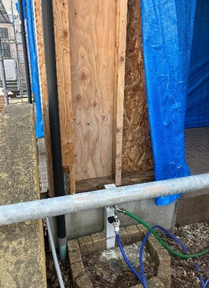こちらは玄関ポーチの袖壁部分ですが、外壁をめくると、バルコニー排水口周辺からの水漏れや、外壁のコーキングの切れが原因による水の侵入で、透湿防水シートには茶色のシミが発生していました。