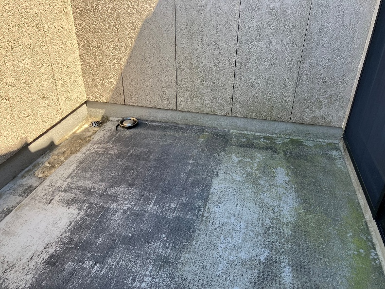 バルコニーの床防水は、経年劣化により、雨水が床の下地へ侵入し、下地が腐食しているせいか柔らかく、足で踏むとふかふかしているところもありました。