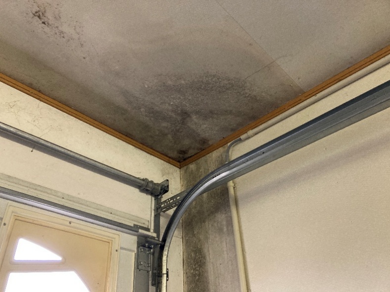 ガレージ内部に雨染みが発生していた部分の排水口周辺ですが、下地が黒く変色し、かなり腐食しているのが分かります。