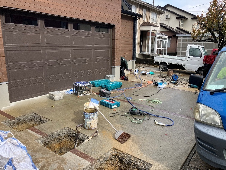 まずはカーポートを安定させる為に必要な柱を固定する基礎の工事から始まります。