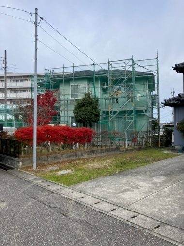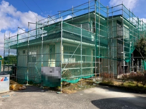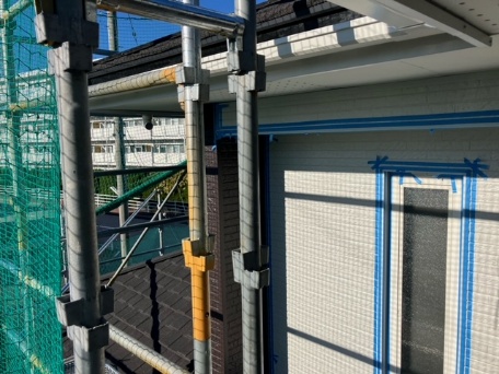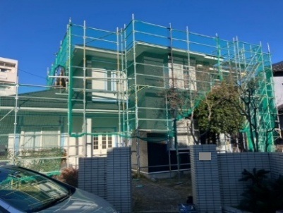 仮設足場の設置になります。足場工事では、転落防止のネットも張り安全対策をします。