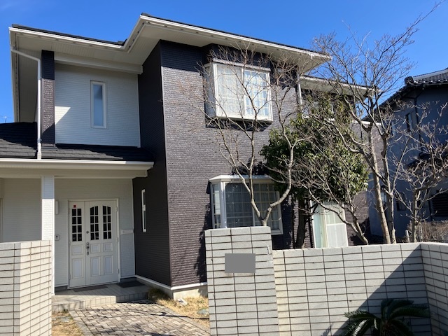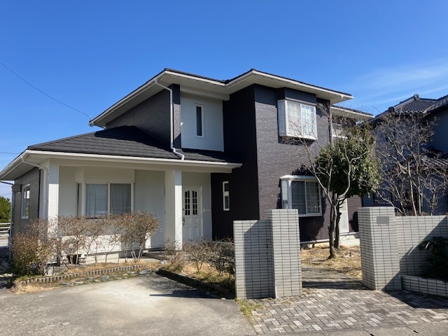 外壁は落ち着いた濃いブラウン色をメインに、ホワイトのサッシもアクセントになり、玄関ドアとポーチ部分をホワイト系で張り分けすることでワンポイントアクセントの仕上がり、新築の様な仕上がりとなりました。