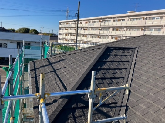 屋根の上には脱着物が少ないので、防水シート張り屋根工事(カバー工法)を完了しました。期間は約2週間程度かかります。
