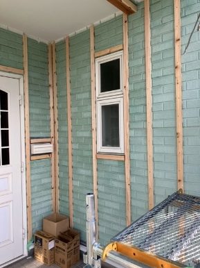 外壁工事に着手していきます。既設外壁に木桟を打ち付けし、金属サイディングを張っていきます。