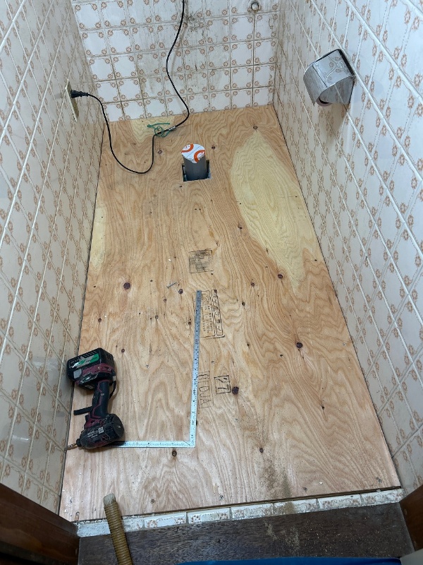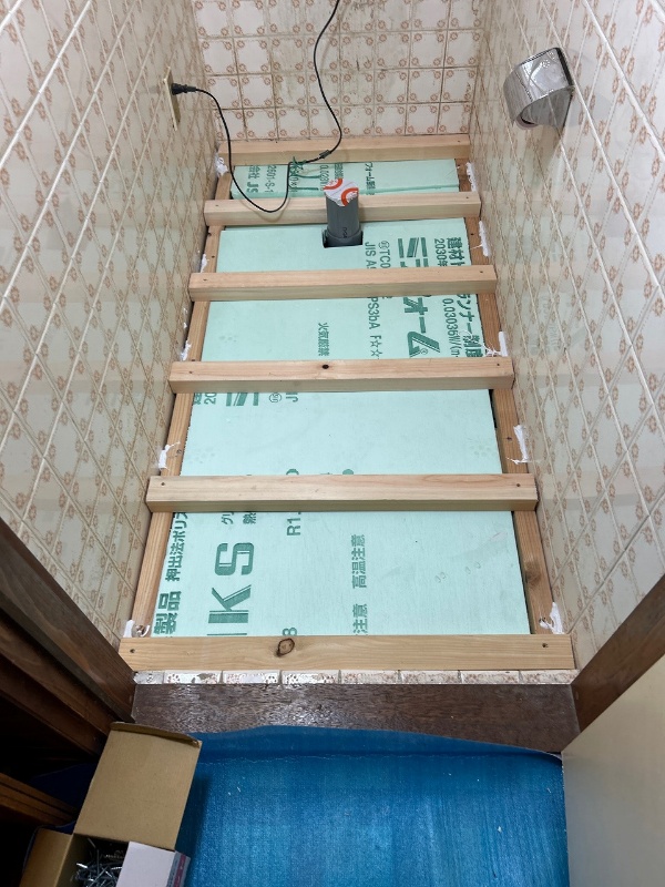 土間コンクリートで高さを上げる方法もありますが、なるべく早く完了したいというお客様要望にお応えする為、工期が短くできるよう床組みでの施工をしていきます。