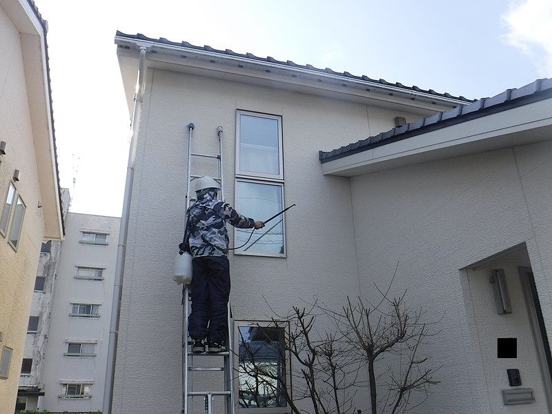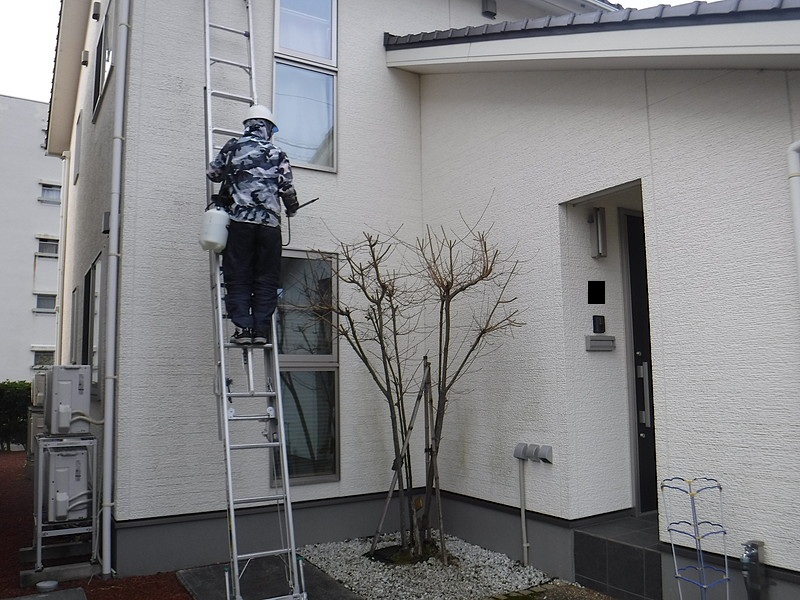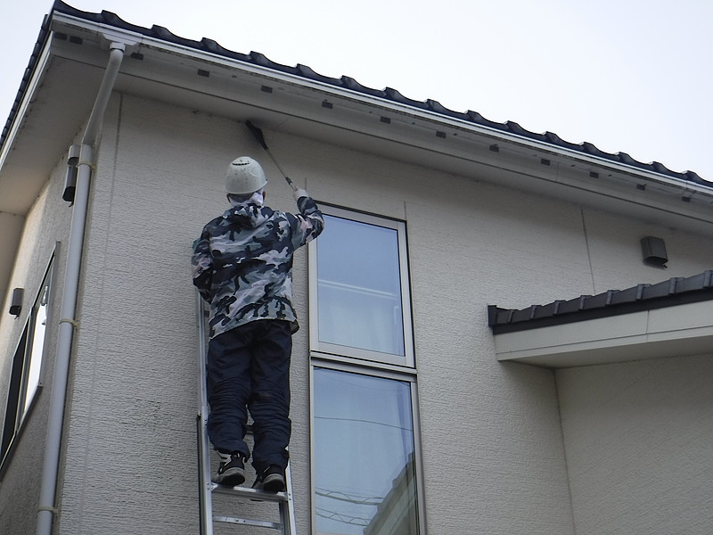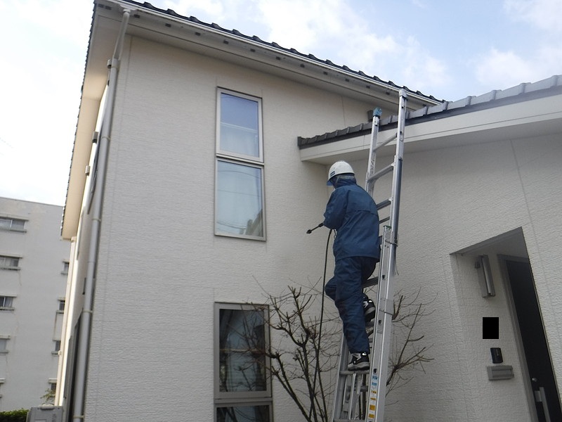 外壁の埃を払い落とした後に、外壁を傷めない程度の高圧洗浄を行います。